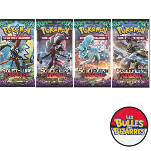 L’Artset Pokémon Soleil & Lune – Gardiens Ascendants regroupe 4 boosters distincts, chacun illustré différemment, permettant aux collectionneurs d’obtenir un assortiment complet des visuels officiels. Cette extension met en avant les Pokémon légendaires et les protecteurs de l’Alola, avec des mécaniques GX puissantes et des cartes à fort potentiel stratégique.