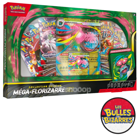 Avec sa carte promo Méga-Florizarre-Ex et sa présence iconique dans l’univers Pokémon, c’est un coffret qui garde une belle valeur de collection.